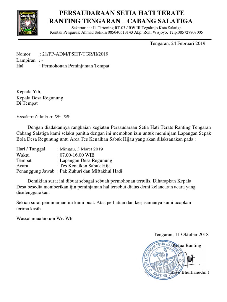 Hak cipta dan merek persaudaraan setia hati terate. Contoh surat permohonan pemakaian gedung gereja untuk natal. Mar 18, 2019 · 21 contoh surat izin sakit orang tua acara. Jun 27, 2019 · 21 contoh surat izin sakit orang tua acara. Psht pati surat pemberitahuan acara cuci mori dari facebook.